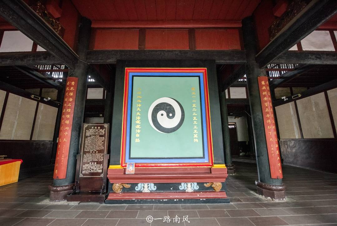 八卦亭的门匾上有“紫气东来”字样,里面供奉着老子骑着青牛的塑像,亭子的周围遍植银杏,春夏两季绿意盎然,到了深秋就变成梦幻的深黄色调,视觉效果尤其震撼,据说每年都吸引很多摄影家专门前来拍摄。