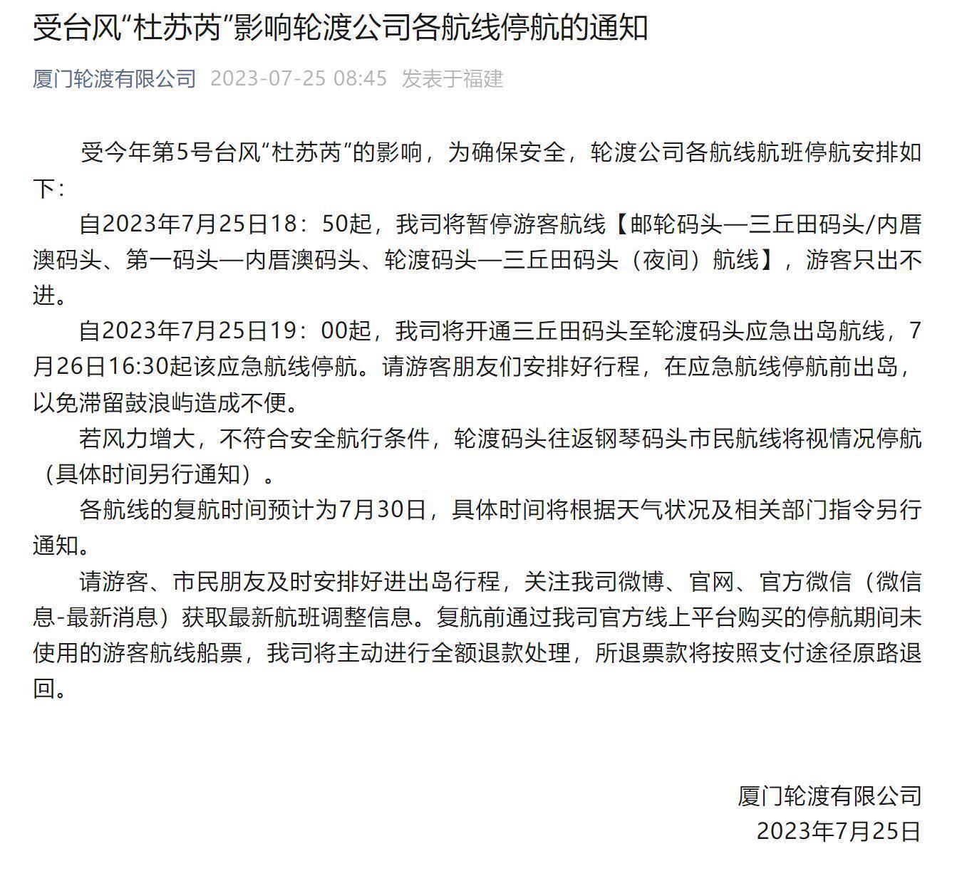 厦门轮渡提醒,请游客朋友们安排好行程,在应急航线停航前出岛,以免滞留鼓浪屿造成不便。同时,若风力增大,不符合安全航行条件,轮渡码头往返钢琴码头市民航线将视情况停航(具体时间另行通知)。各航线的复航时间预计为7月30日,具体时间将根据天气状况及相关部门指令另行通知。