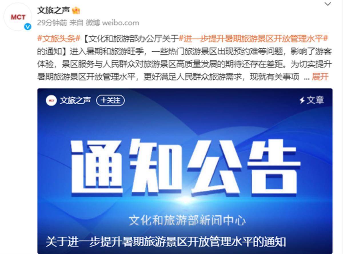 7月25日,文旅部官方政务新媒体平台“文旅之声”发布《关于进一步提升暑期旅游景区开放管理水平的通知》。其中提到,各地文化和旅游行政部门要联合公安、市场监管、网信等部门,加大对“黄牛”、第三方平台违规囤票、倒票等行为的打击力度,同时完善旅游景区门票分销系统,有效防止“黄牛”挤占票源。加强旅游市场秩序监管,严查欺客宰客等行为,维护景区游览秩序,净化旅游消费环境。会同发展改革等部门加强价格监管,严格查处价格违法行为,保障游客权益。