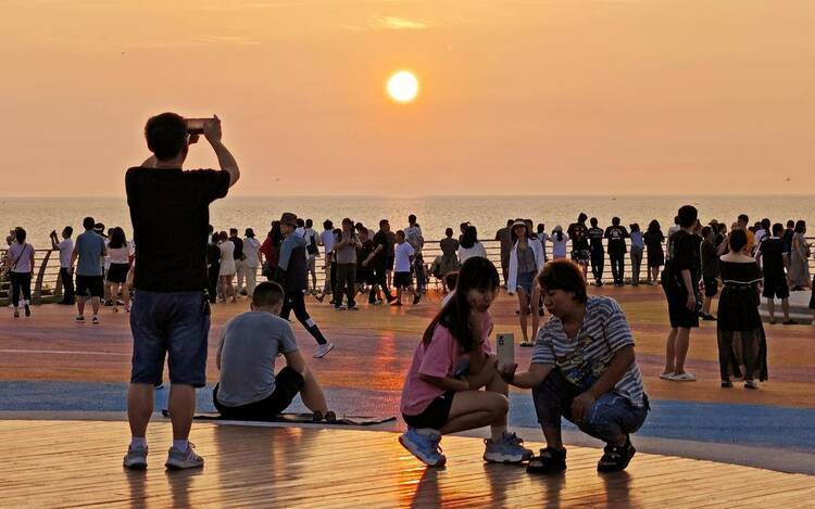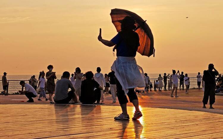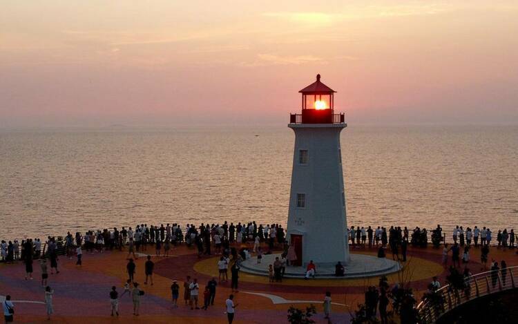 7月23日,众多游人聚集在大连市甘井子区泊霞湾灯塔处畅享日落美景。日前,随着大连市甘井子区在泊霞湾举行革镇堡街道羊圈子村泊霞湾文旅项目签约暨景区揭幕仪式,标志着革镇堡街道泊霞湾文旅项目进入实质推进阶段,泊霞湾也成为当下大连市的网红打卡地。每到傍晚十分,众多游人扎堆泊霞湾观景台赏景、拍照,尽享日落盛宴。(记者 孙福义 摄影 特约记者 刘德斌)