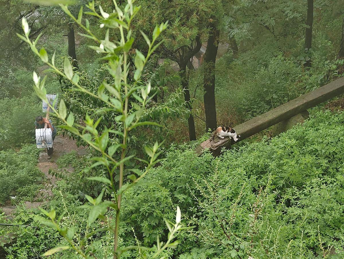 插曲就是缓慢爬山的过程中,可以偶遇挑山工和一只野猫,都是为了生存,付出才有收获。