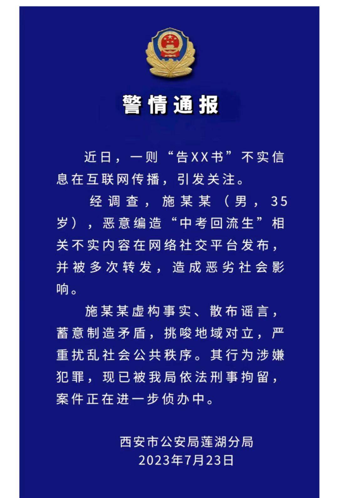在这过程中,警方发现35岁的施某在网上恶意编造“中考回流生”相关不实言论,散布谣言,挑唆地域对立,严重扰乱社会公共秩序,涉嫌犯罪,已将其刑拘。