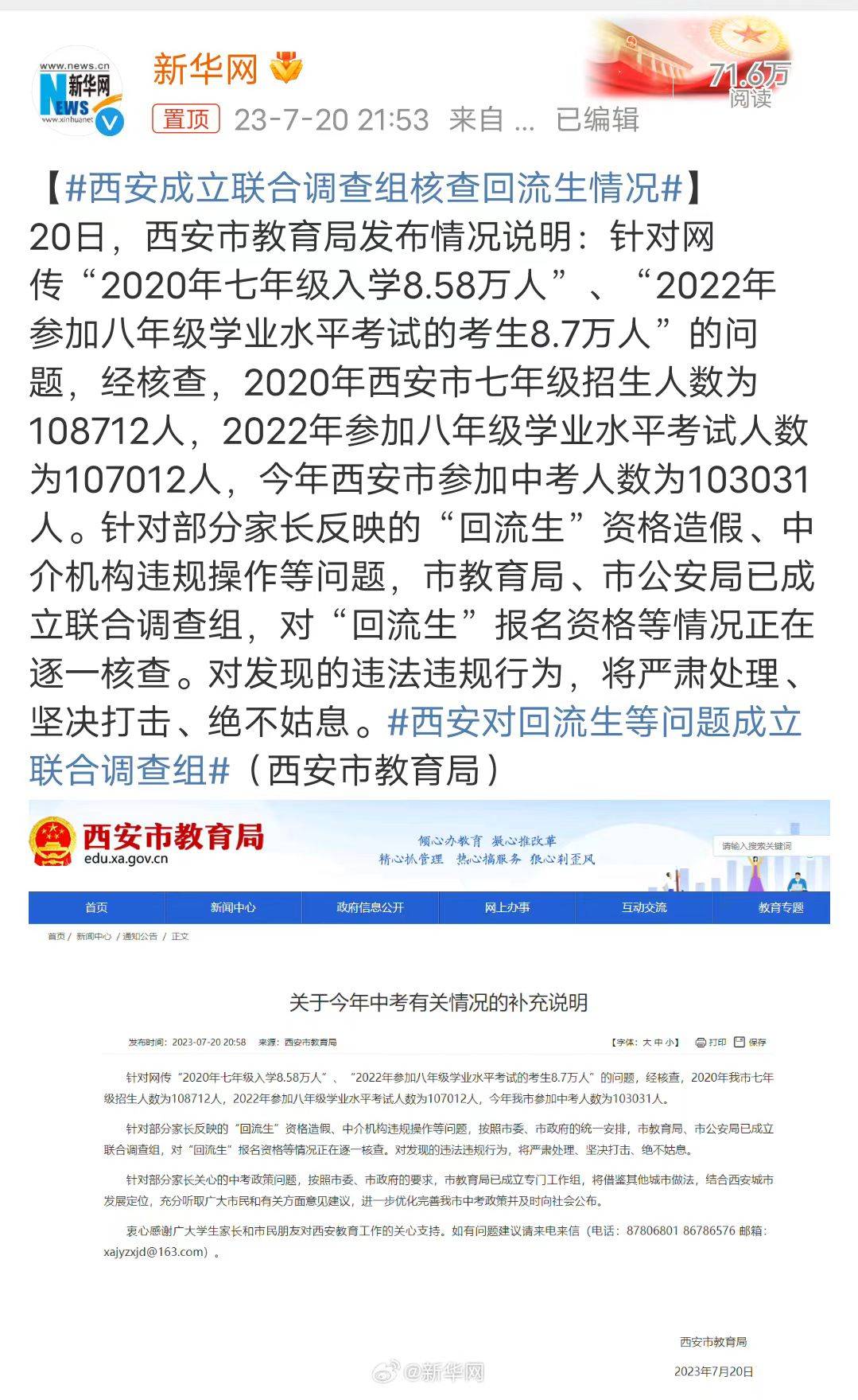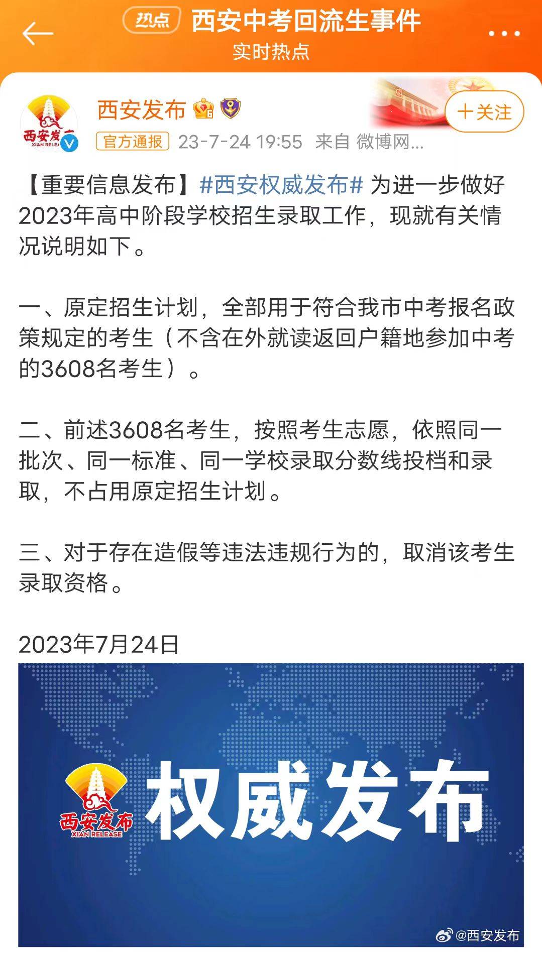 7月24日下午8点左右,官方发文称,为了进一步做好招生工作,将把原本的招生名额全部用于符合中考报名政策的考生,其中不包括所谓的回流生,也就是那3608人。