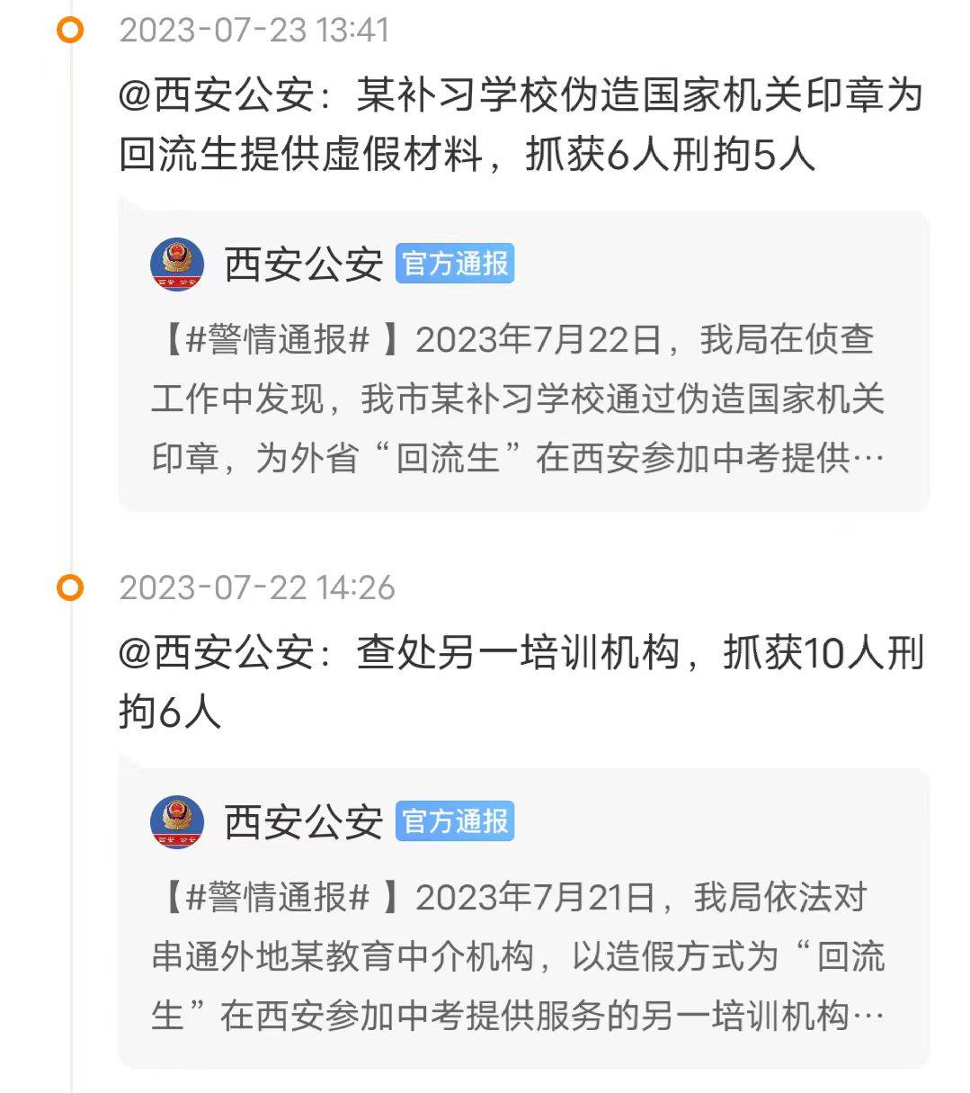 7月21、22、23日三天,西安公安发现并打击了三个存在违法行为的机构,其中两个是为“回流生”提供服务,涉嫌违法的培训机构,另一个是通过伪造国家机关印章,为外省“回流生”在西安参加中考提供虚假资格审查材料,涉嫌犯罪的补习学校。