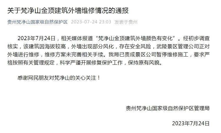 7月24日晚,贵州梵净山国家级自然保护区管理局发布《关于梵净山金顶建筑外墙维修情况的通报》。通报全文如下: