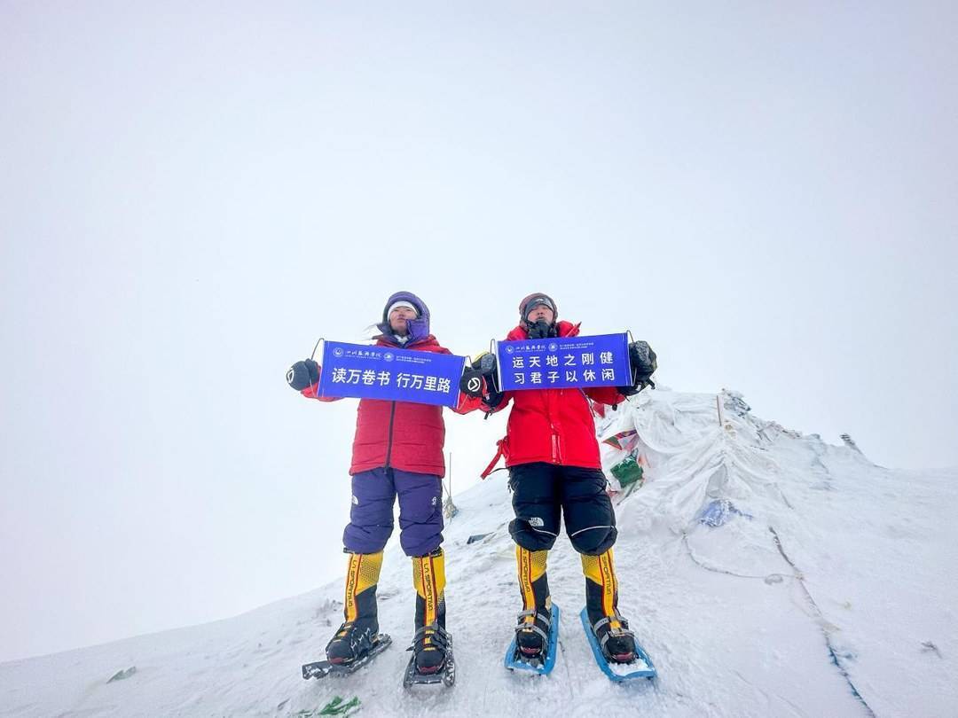 近日,在2023年新疆慕士塔格登山季中,四川旅游学院户外教学团队青年教师杨小华带领2名户外专项学生和2名校友成功登顶慕士塔格峰。