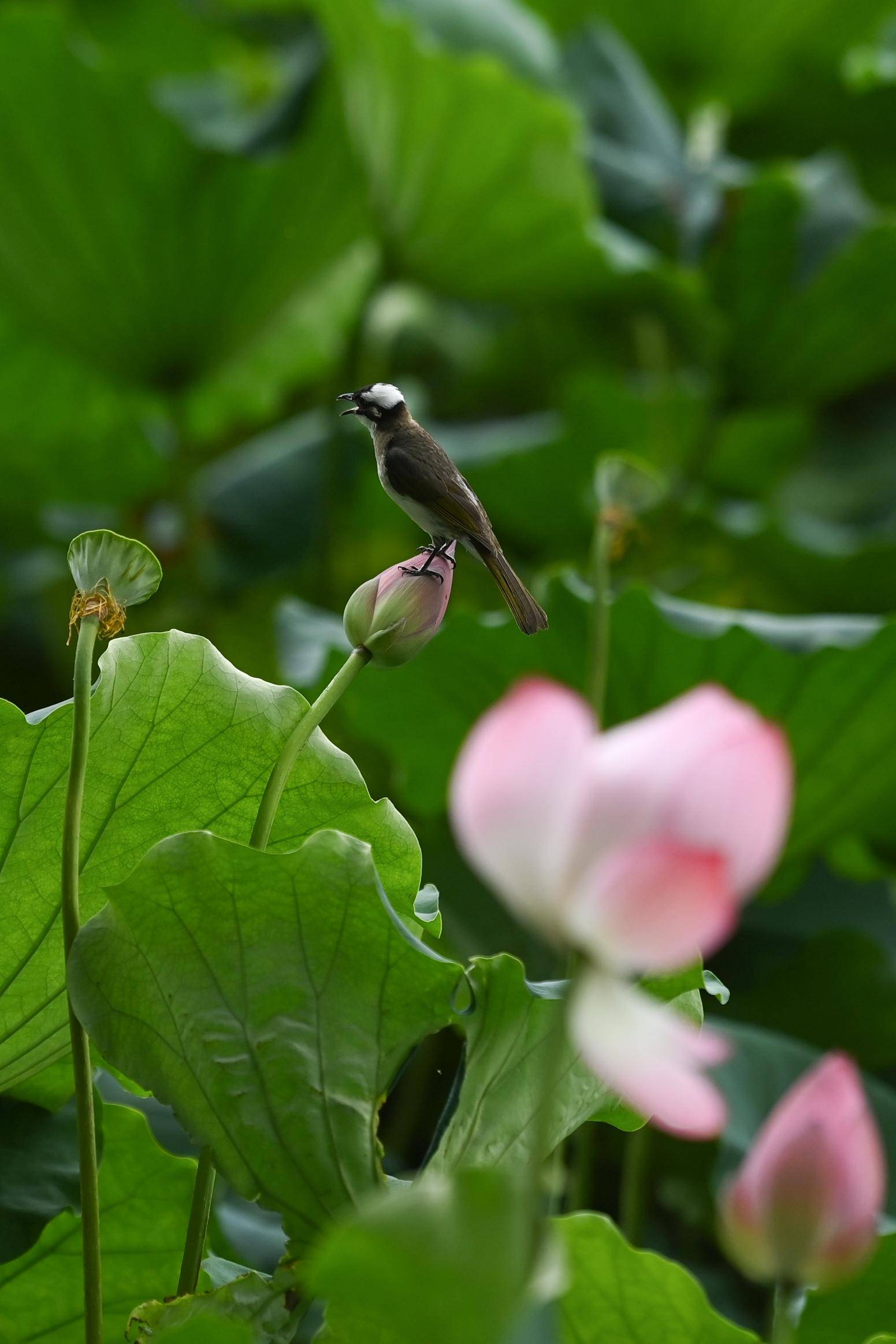 7月25日,一只白头鹎站立在西湖景区一朵待放的荷花上。 新华社记者 黄宗治 摄