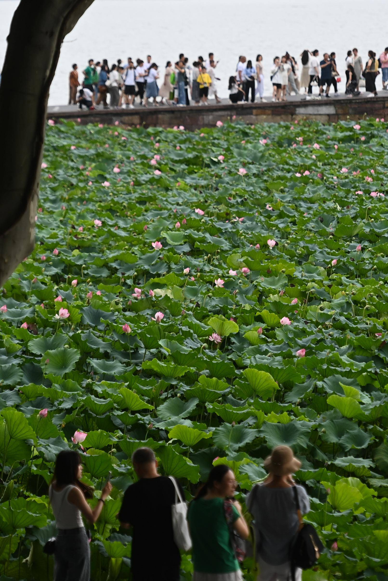 7月25日,游客在杭州西湖景区赏荷游览。 新华社记者 黄宗治 摄