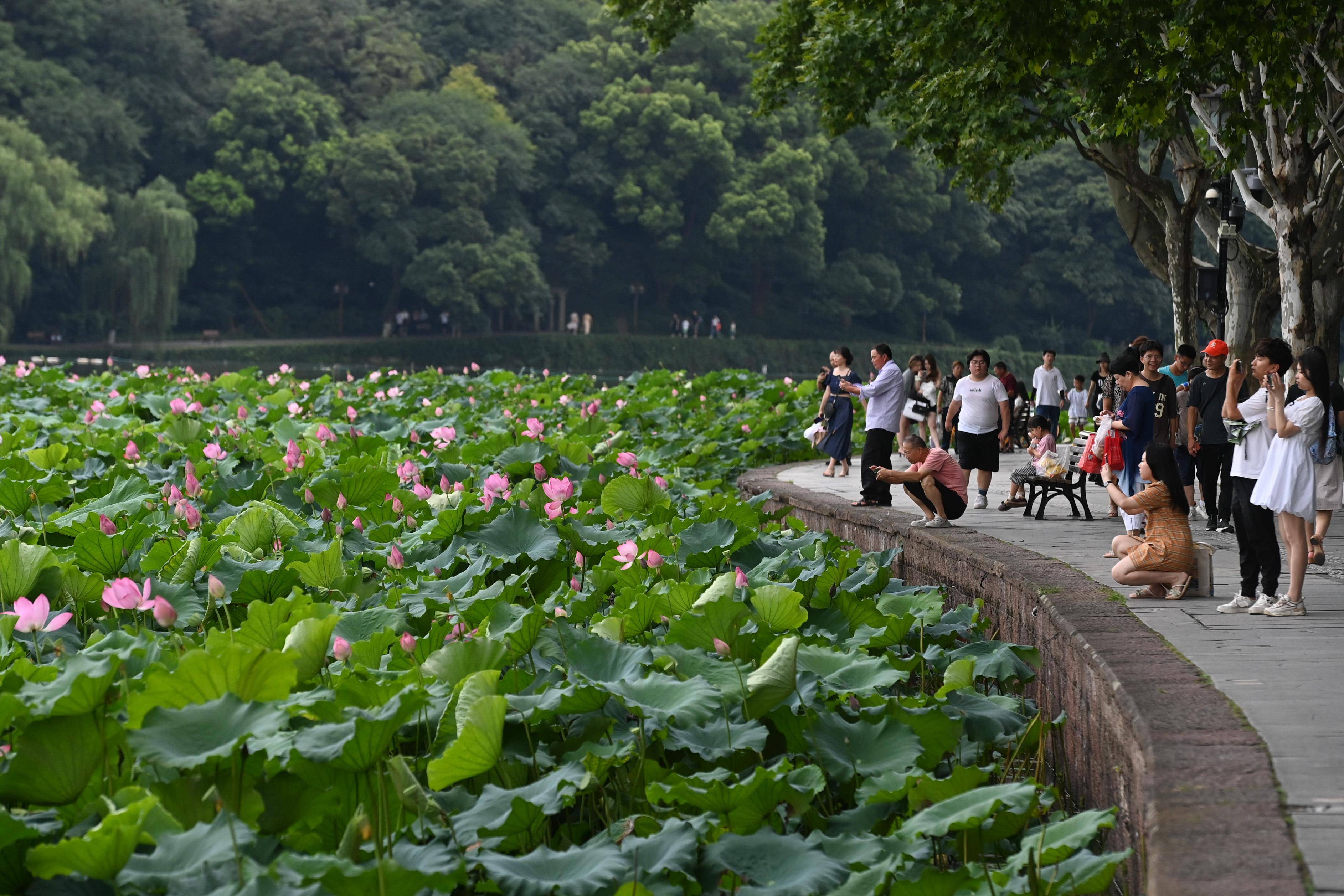 时值盛夏,杭州西湖景区荷花竞相绽放,呈现出“接天莲叶无穷碧,映日荷花别样红”的美丽景象。