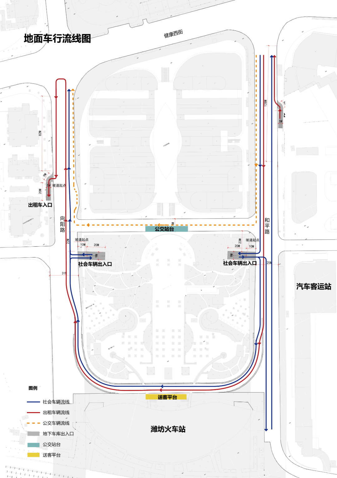 潍坊火车站北广场地下停车场由潍坊市城投集团权属基建投资公司投资建设,停车场内建有社会停车位593个,出租车蓄车位100个。社会车辆可以从向阳路东侧及和平路西侧的双向社会车辆出入口出入。出租车采用单行道,从向阳路西侧出租车入口进入地下停车场,在出租车候车区接到乘客后,从和平路东侧出租车出口驶出。