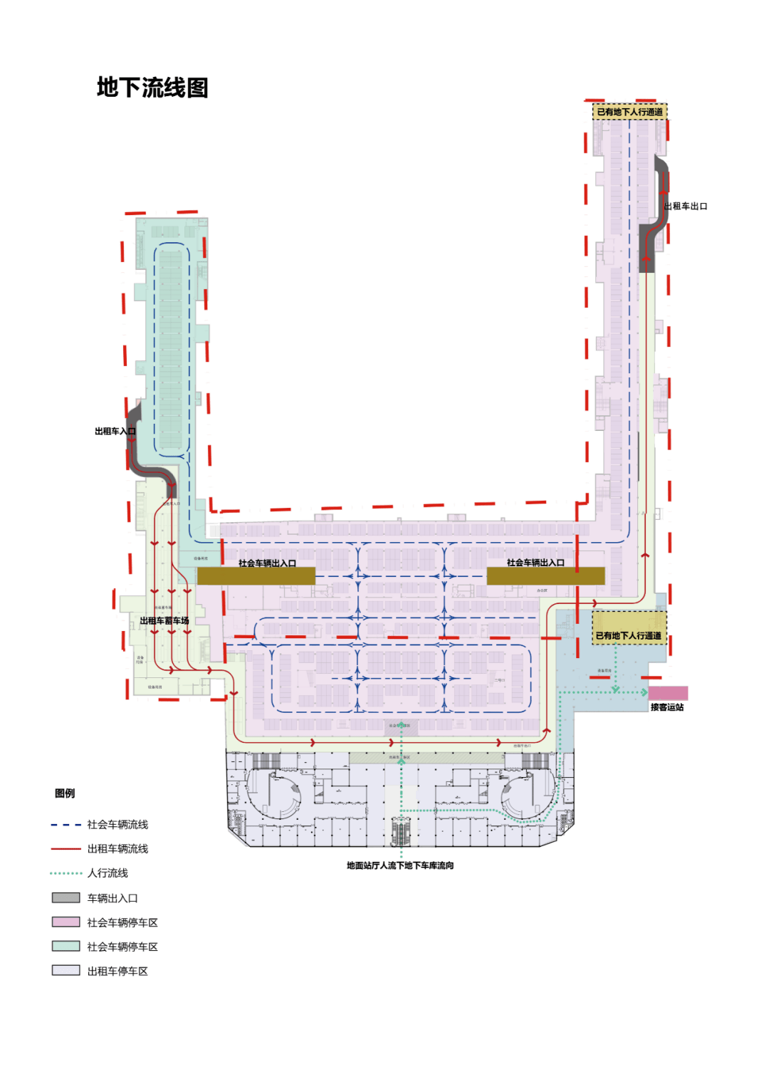 3.出租车由向阳路西侧出租车入口进入地下停车场,在出租车接客区接到旅客后,从和平路东侧出租车出口驶出。