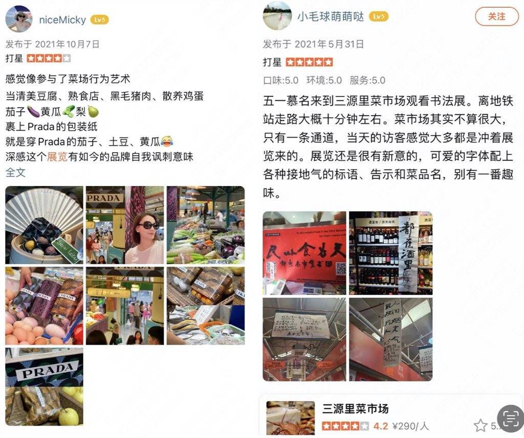 “感觉像菜市场行为艺术,买花的话会有Prada印花包装。”“三源里的书法展,把艺术融入了生活,又本土又俏皮。”“可爱的字体配上接地气的标语、告示和菜名,字的内涵一下子被具象化了。”慕名前来的年轻人记录下“展览观后感”。