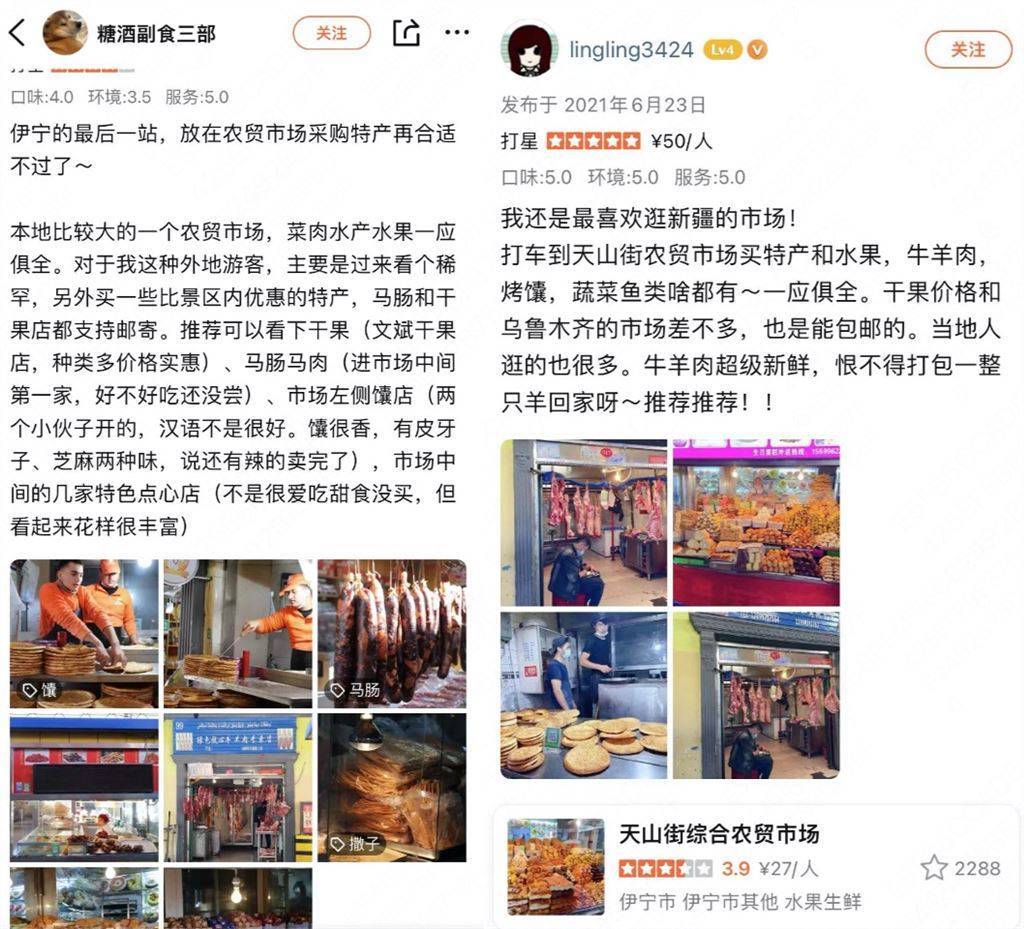 在新疆伊宁,大众点评上天山街综合农贸市场的评价区,芝麻馕、酸奶疙瘩、马肠马肉、各色干果则是内陆游客笔下的“稀罕货”。