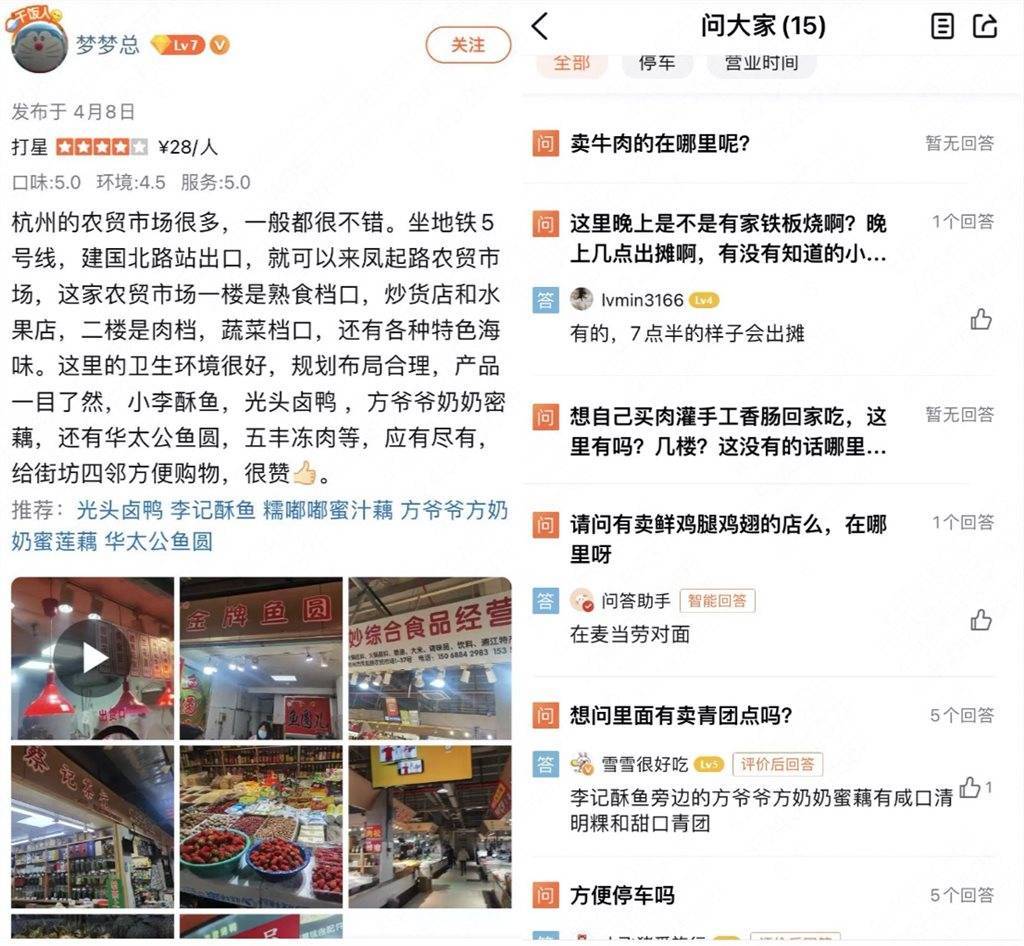 美食测评之外,年轻人甚至把不少平台上的评价区、问答区和攻略笔记,写成了一份“菜市场导览”。“5号线坐到建国北路,一楼是熟食档口,炒货店和水果店,二楼是肉档、蔬菜档口,以及特色海鲜。”“总体卫生环境好,规划合理布局,产品一目了然。”“酥鱼先称后炸,29块钱大约7、8块,糯米藕一个差不多20块。”以凤起农贸市场的评价区为例,菜场布局、菜品价格、出行路线、营业时间……各类信息事无巨细。