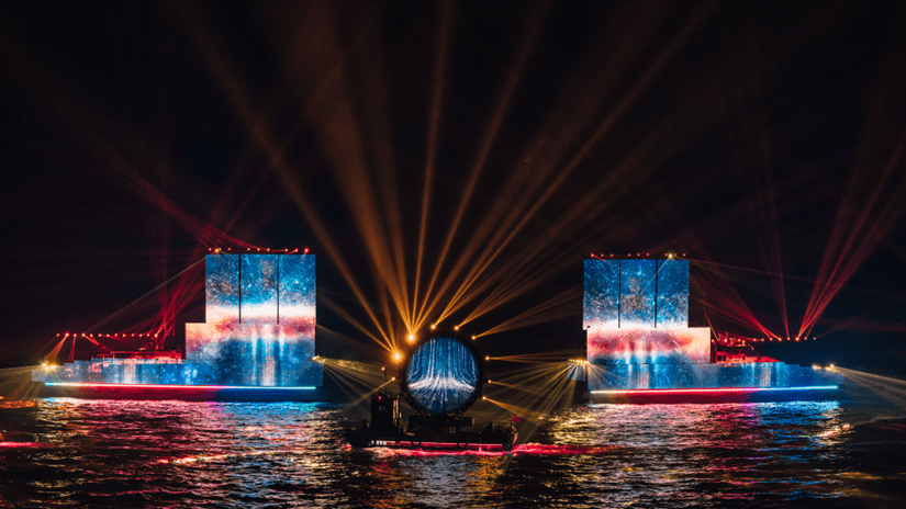 以两艘大船作为主表演船、六艘小船作为辅助表演船,运用船载智能数控机械、数字灯光、三维影像等前沿高新科技手段,展示水火交融特效,带给观众超现实震撼观感。提出“无线网+无线电”的解决方案,研发出可靠高效的具有自主知识产权的集成设备系统,确保达到音画同频巅峰效果。