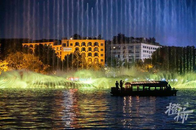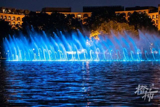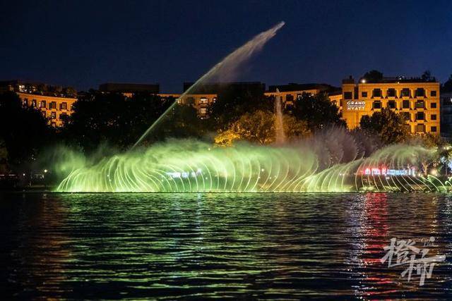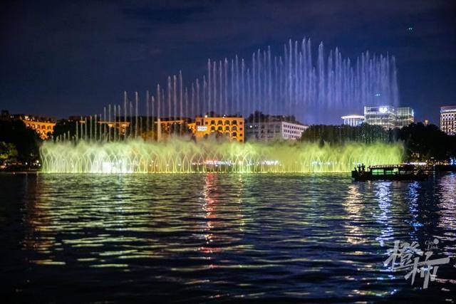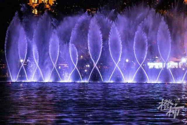 随着经典的《梁祝》旋律响起,在湖滨三公园附近湖面上,强劲的水柱伴随着音乐和灯光起起落落,如梦似幻,场面震撼。