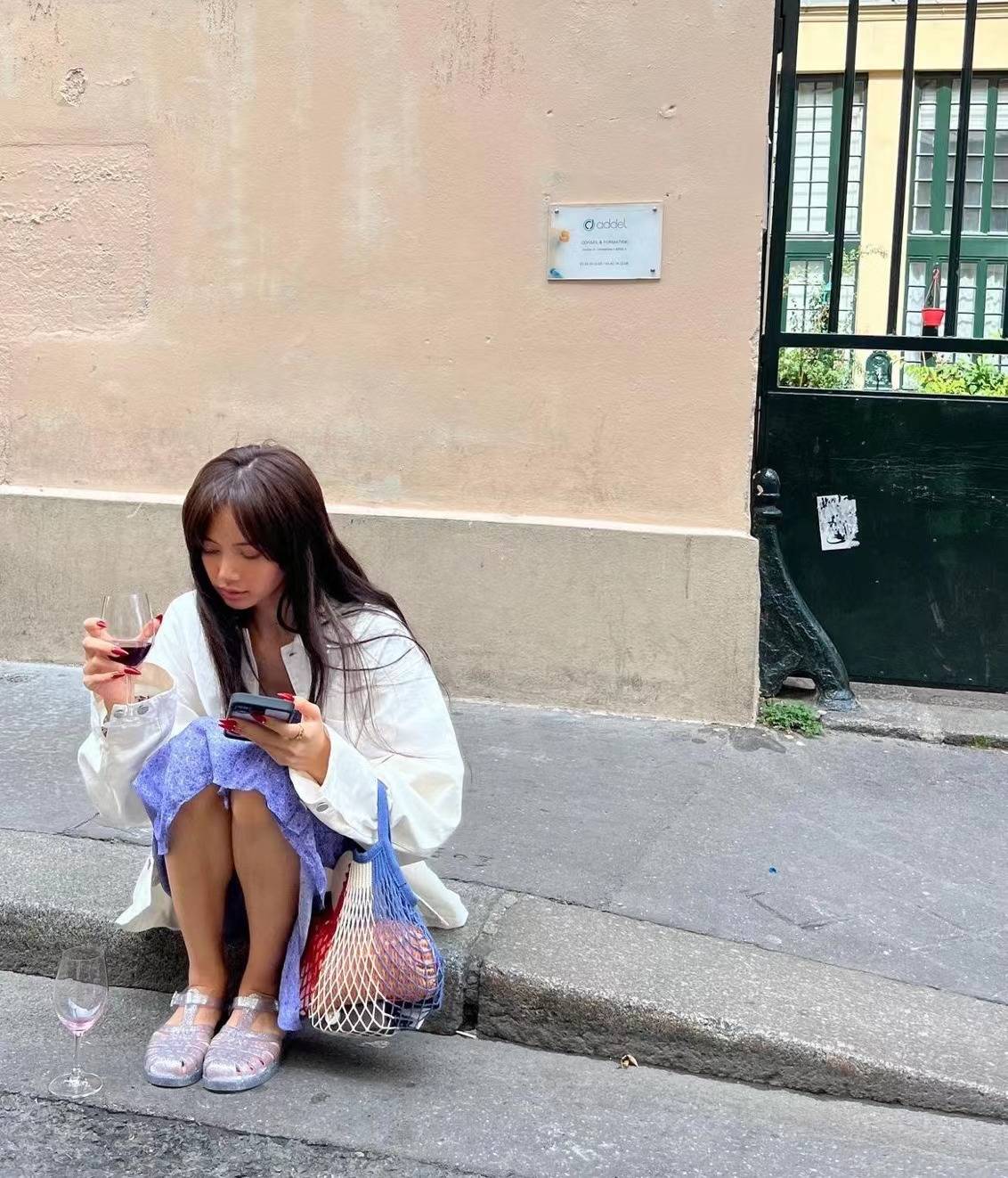 原标题:Lisa晒巴黎街头游玩随拍 坐路边喝红酒飒爽随意