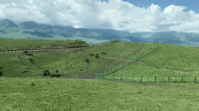 此起彼伏的山坡轻轻覆盖成绿毯,一路盘旋上山真的迷人,还有森林和河川,蓝天和白云,成群的羊马散落在山坡上,就是一幅动态的windows桌面。