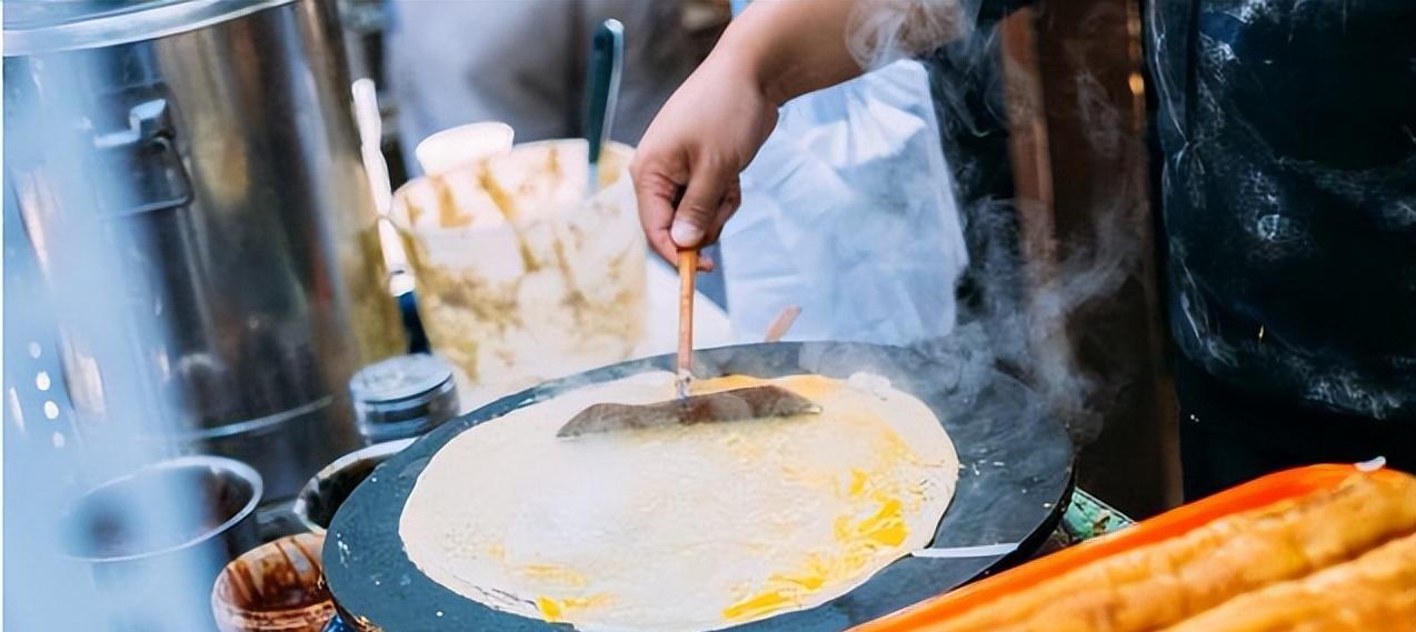 天津煎饼果子被列入了市级非遗,面皮呈现黄绿色,厚薄均匀,咬上一口,可以闻到豆面的香味和鸡蛋的香味,里边再加上果子,吃着焦脆弹牙,百吃不厌。
