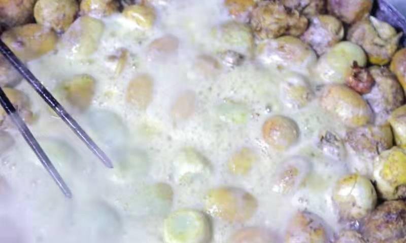 老板每天把毛蛋和实蛋准备好之后,放到一个平底锅上面,倒点油不停地煎,但凡从他的摊位上经过,都能看到这里一片拥挤的景象,客人们总是争先恐后地过来买,老板自然是停歇不下来,一锅锅毛蛋和实蛋,不一会儿就卖光了。