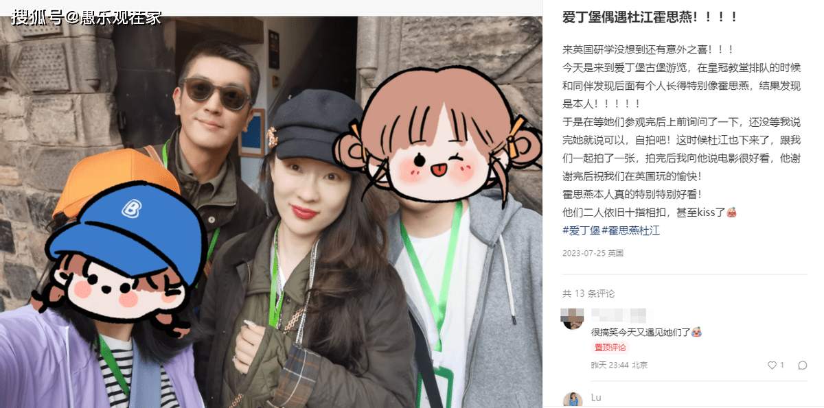 这位网友称自己是来爱丁堡研学的,趁空闲时间来到爱丁堡古堡游玩,没想到竟然有意外之喜。在皇冠教堂排队的时候,她和朋友发现有个女孩长得很像霍思燕,走上前确定是她本人后,原本想说拍合照,但话还没说完,霍思燕就说可以,自拍吧!惊喜还没完,没多会杜江也出现了,还加入了合影镜头中。
