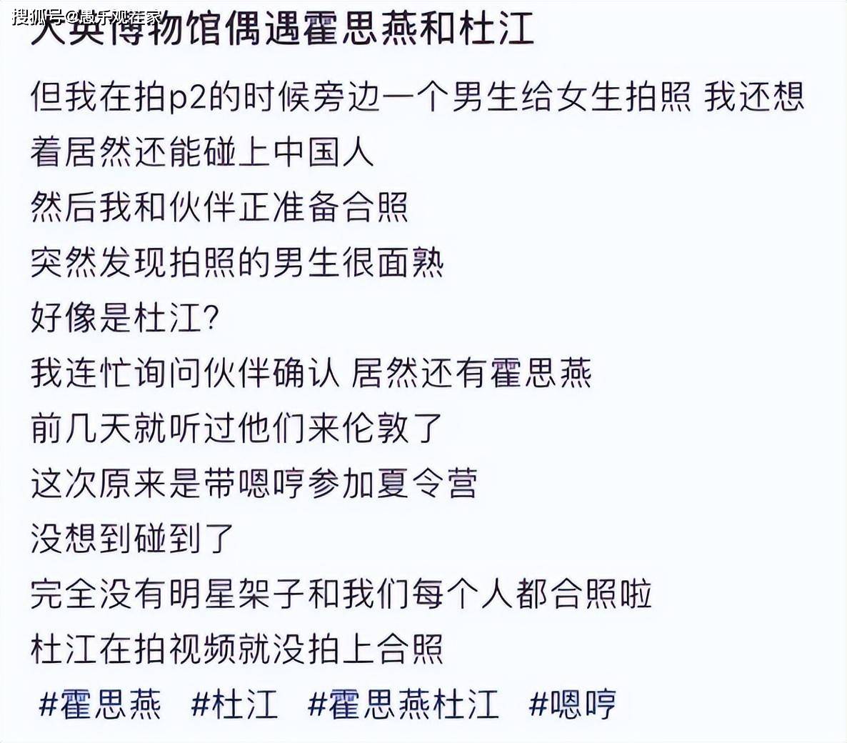 7月25日,有网友发帖称在英国爱丁堡古堡偶遇霍思燕和杜江,当时夫妻俩人正在排队等候进入古堡。在确认的确是二人后,还与他们拍了合影。照片发布后,立刻引起网友们的热议。