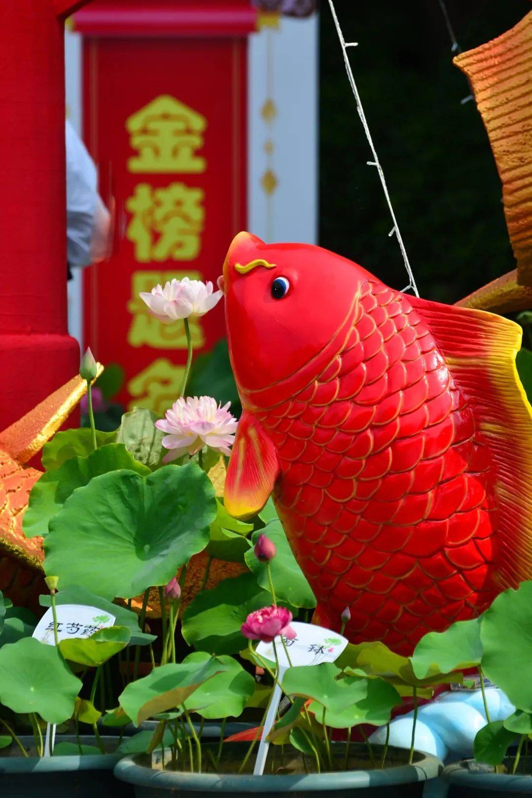 翩翩起舞的蜜蜂,悠然自得的云彩,配上喜气洋洋的灯笼,东门外广场上一片和谐美好。那边钢琴广场上的“鱼跃龙门”蓬勃向上,有着梦想成真、金榜题名之意。