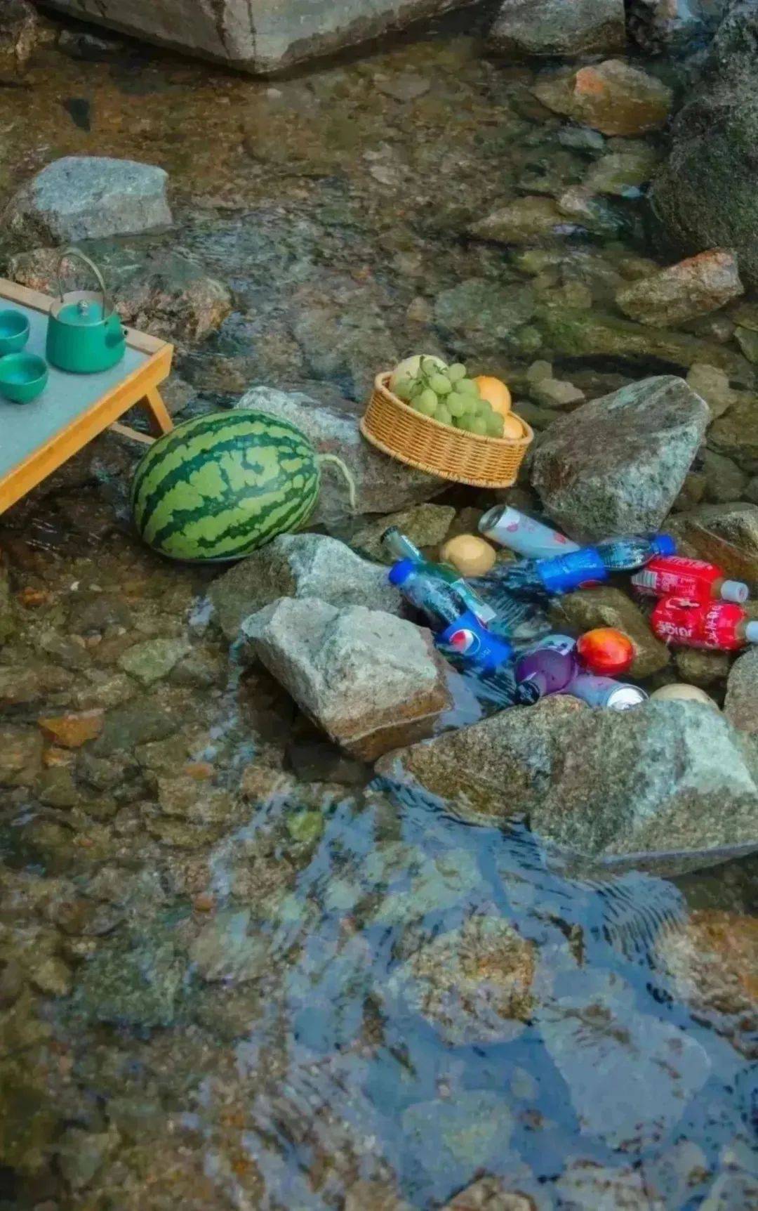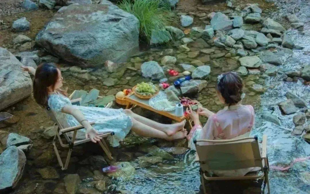 于瀑布下摆一张竹椅,在山水之间感受向往的山居生活。冰凉澄澈的泉水漫过脚面,再来一口清甜的西瓜,舒适惬意。