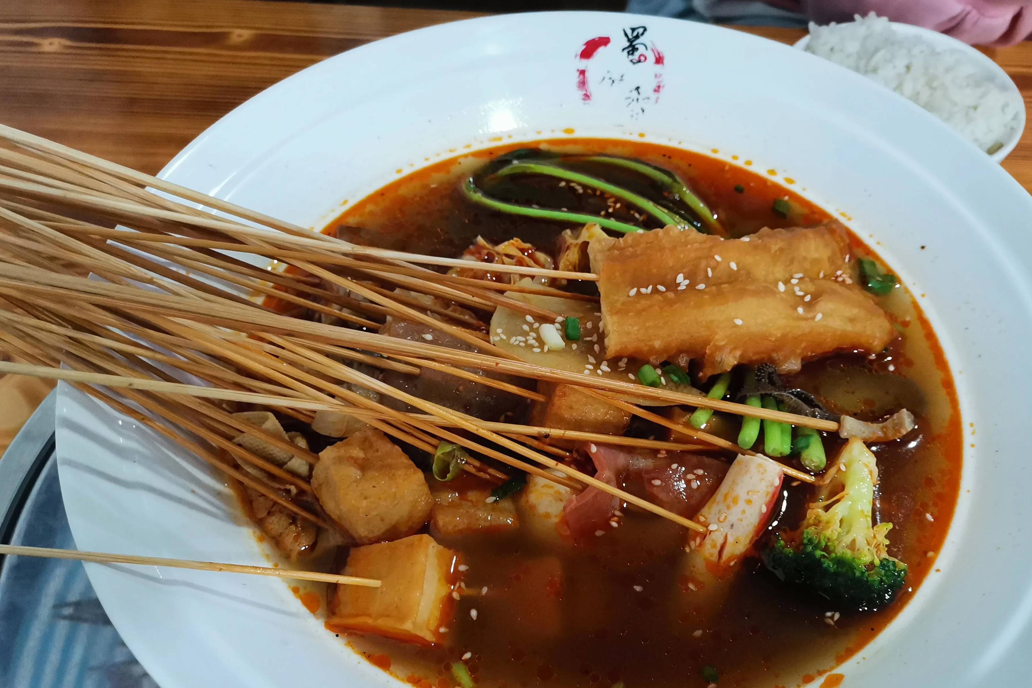 那是我们第一次吃串串,在此之前我们只在当地吃过羊肉串。那也是我们第一次见识了重庆的辣,我们点了微辣,结果自认为还算能吃辣的我们,只吃了几串,嘴巴上、肚子里就像着了火。