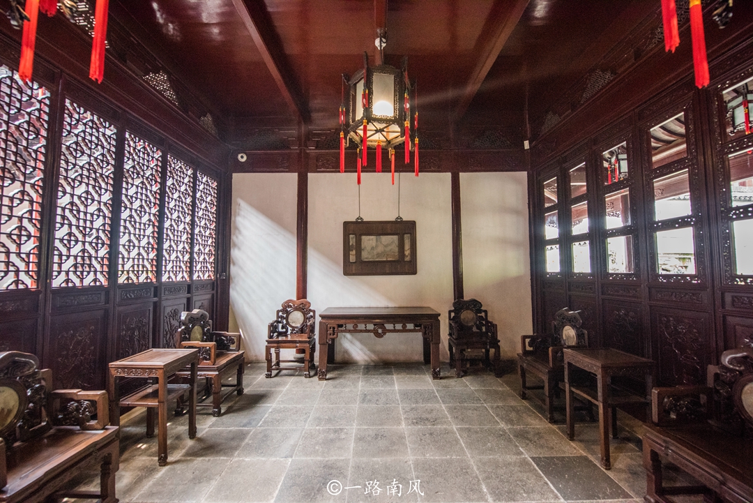 江南园林的特点是于方寸之间构筑写意山水,突出人与自然的和谐美感,室外是灵秀天地,室内的字画、雕刻、摆件,小至窗户的设计也是极尽考究。
