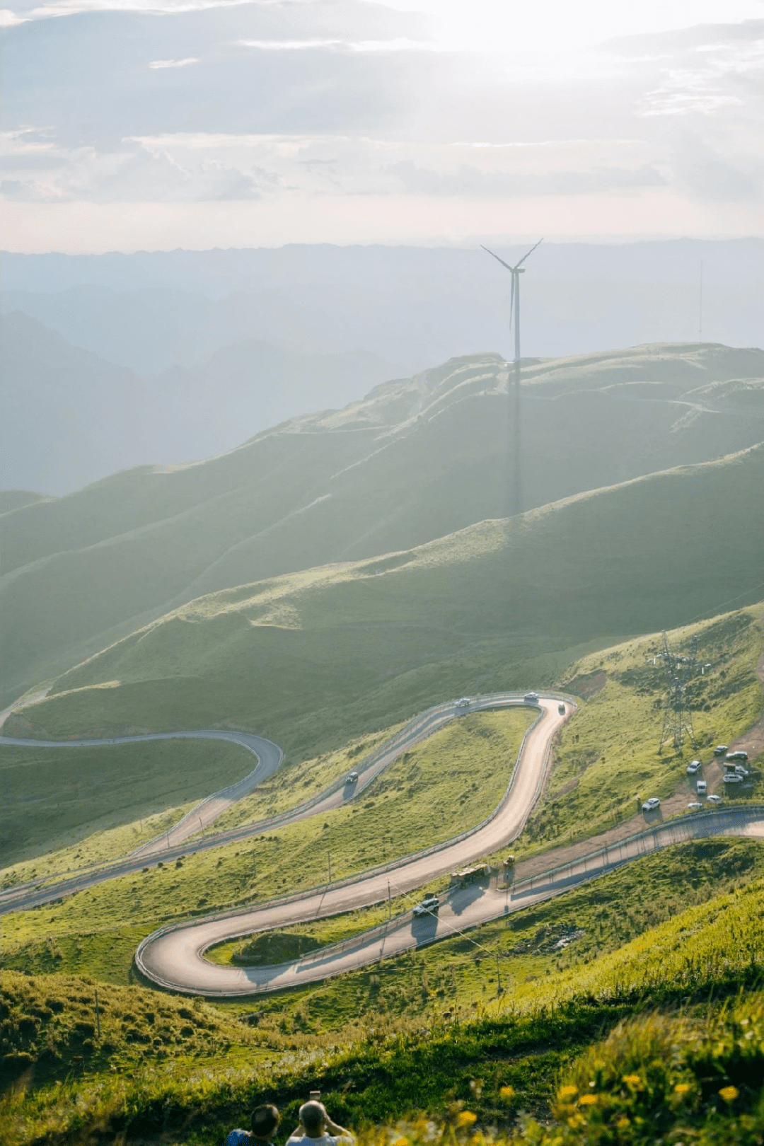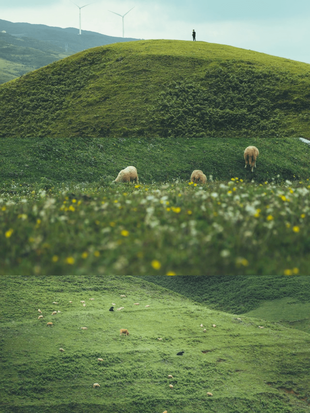 作为乌蒙山重要的风电基地,云端之上的草原还伫立着无数“大风车”,迎风齐齐转动的模样异常壮观。