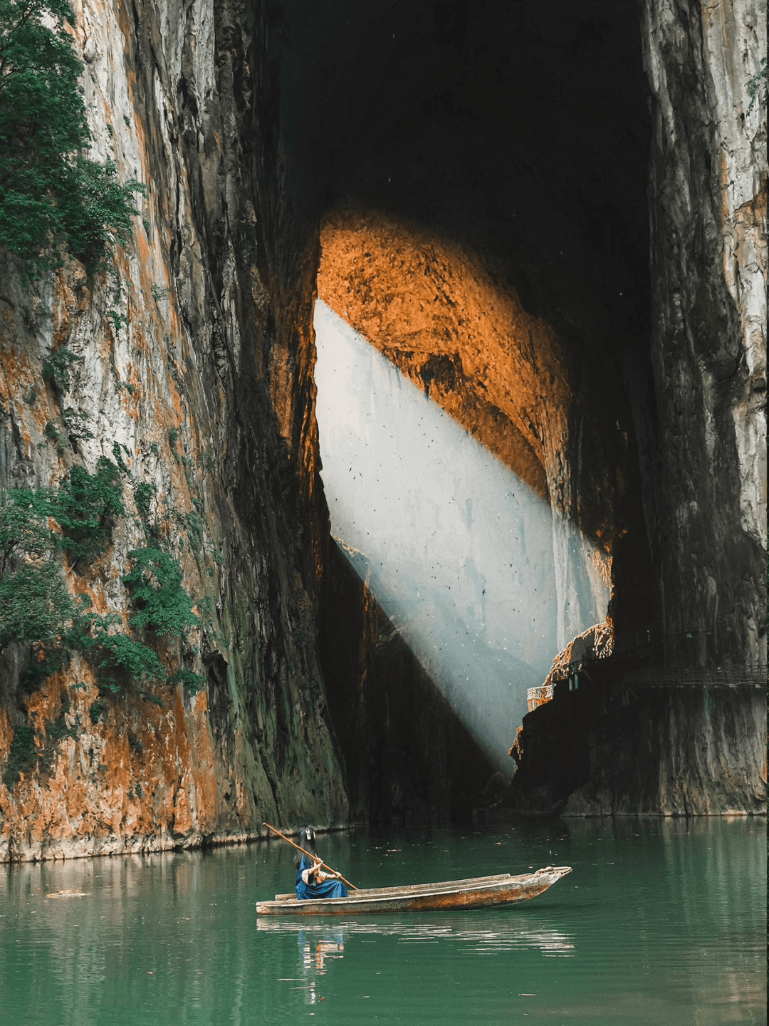 连接天地的通天门,绚丽的神光乍现,划船在其中游览,就像是走进了《盗墓笔记》里的世界。