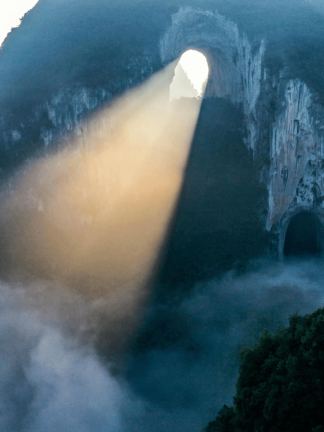 更难得的是,在格凸河还有一处彰显神力的地方,阳光透过通天洞斜开的“天窗”照射下来,落入水中,形成一道“天地神光”,犹如神迹一般。