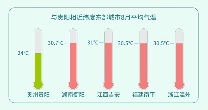 这就是为什么贵州最热月平均气温在22℃-26℃之间,像“中国凉都”六盘水盛夏时不时就会突破20℃低温,就连省会贵阳,也极少有38℃的酷热天气,羡煞东部一众同纬度城市!