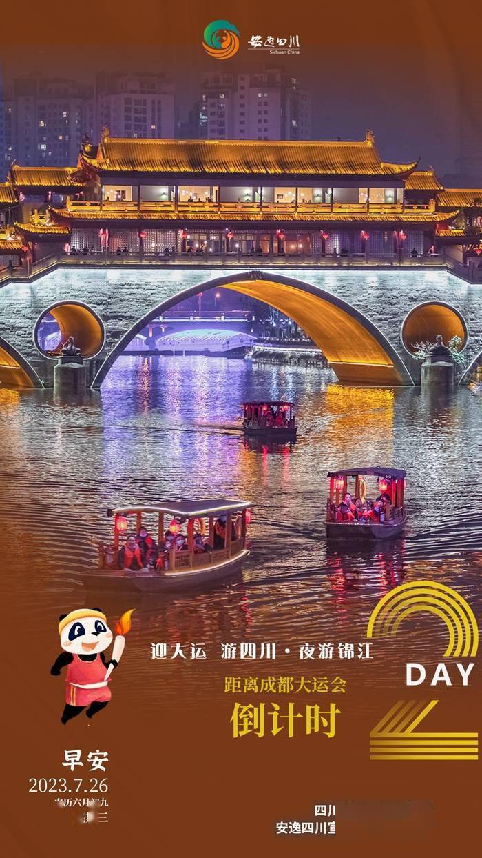 7月26日,星期三,距离成都大运会还有2天。今日安逸四川日历海报体验夜游锦江,感受诗意烟火。