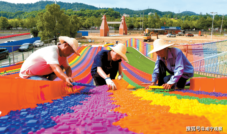 7月19日,咸安区浮山街道考拉壹佰乐园中心项目,施工人员正在安装彩虹滑道。