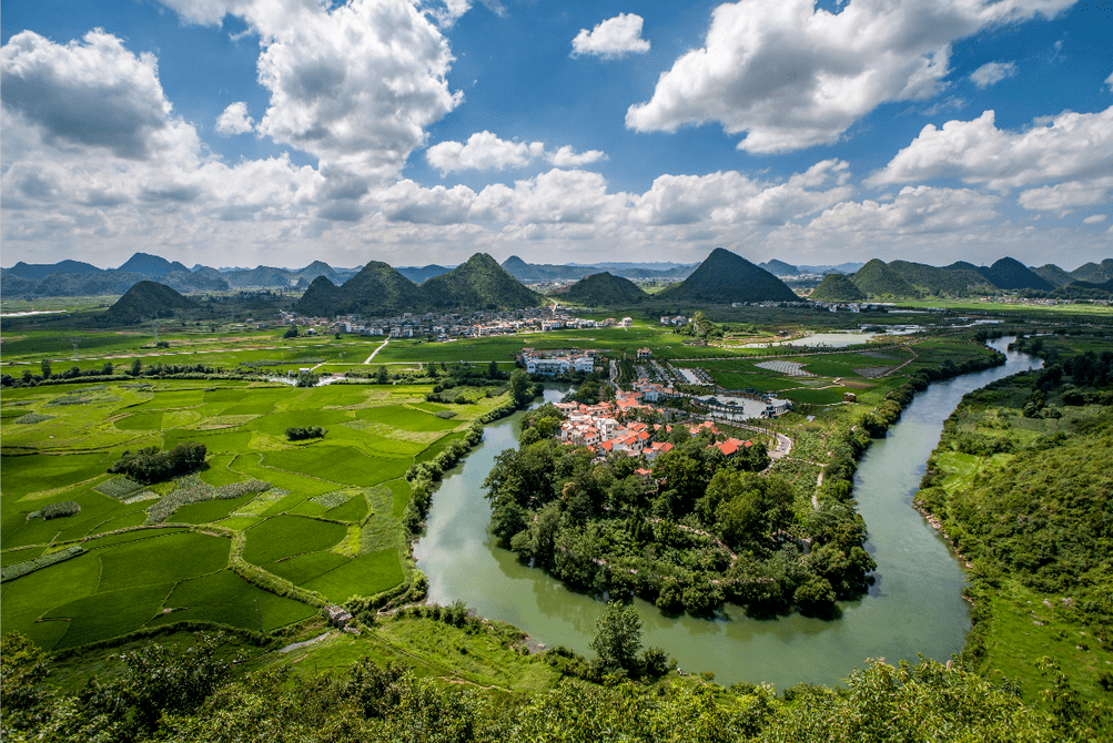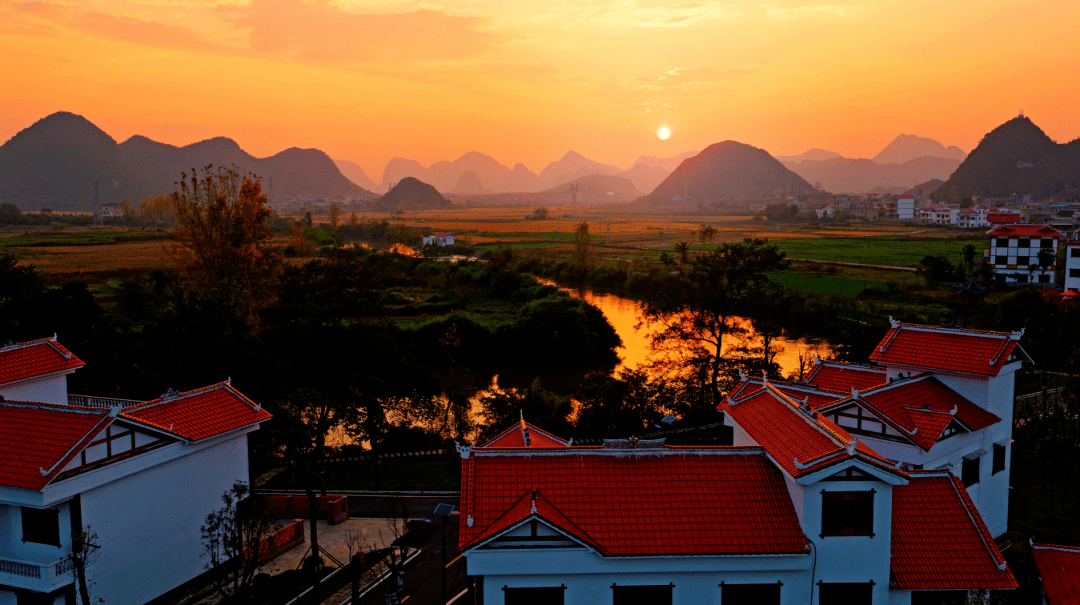 蓝天白云、青山绿水,星星点点的房屋散落在大地上,落日天边的橘、勾勒出一幅绝美的田园风景图。