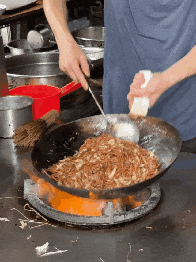 老板风风火火地甩动铁锅,转眼间几盘牛肉面/粉丝就出锅了。