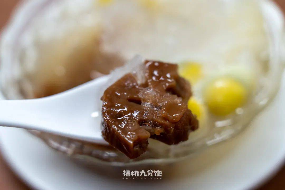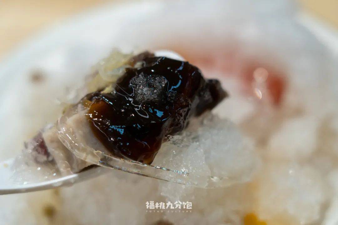 如果说泉州四果汤的特色是石花膏(透明的胶质物质,空心粉形状,晶莹剔透),那漳州四果汤则是上头码着小山丘高的「蜂蜜刨冰」。