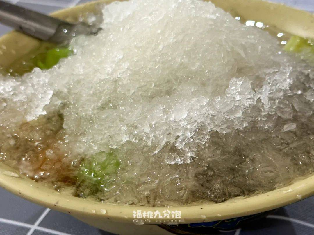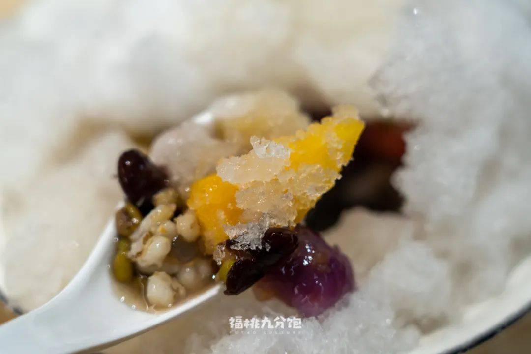 ▲用刨冰机打出来的碎冰,堆放在满满的四果汤上,最后淋上一勺厚实香甜的蜂蜜
