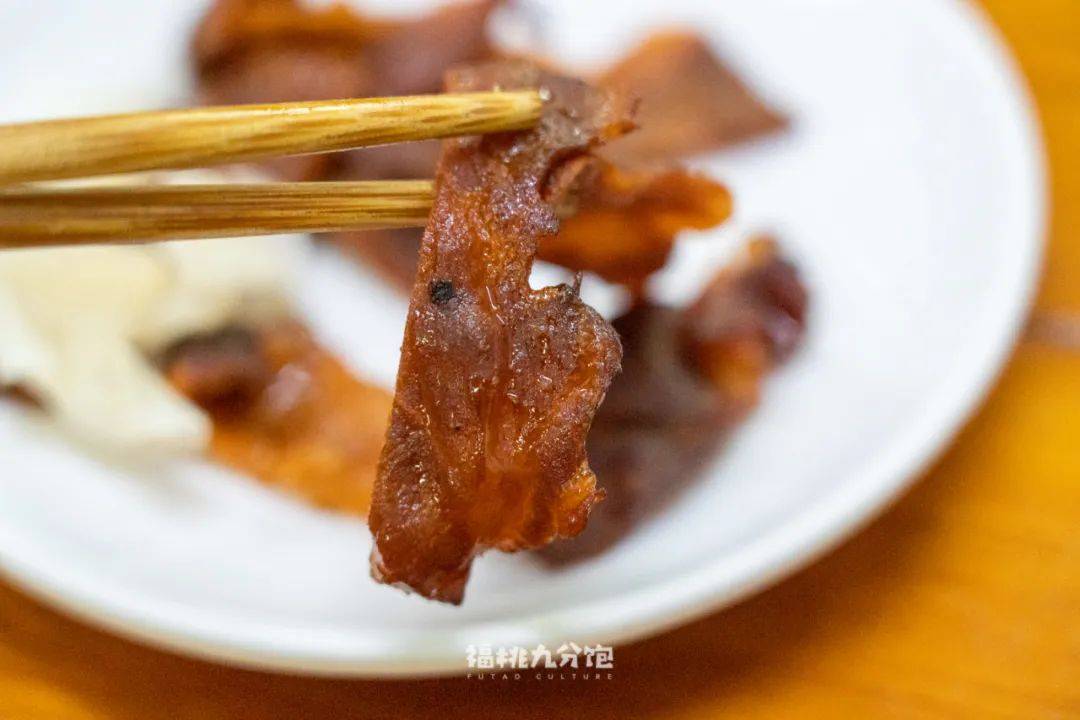 ▲焙肉是意外之喜,闻上去有种烤制的焦香,又有点烟熏的味道,吃起来的口感有点类似猪肉脯