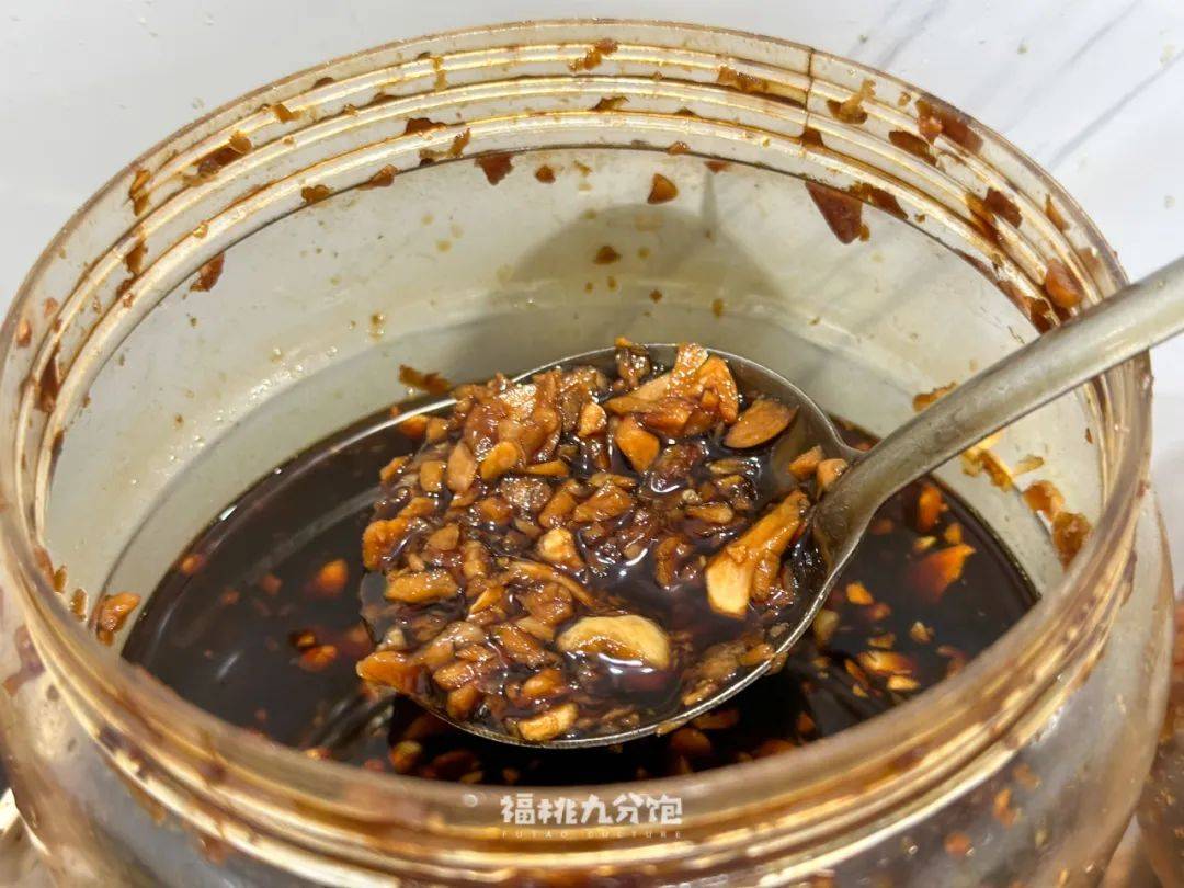▲店家自制的蒜蓉酱油,蘸生烫吃,香晕了