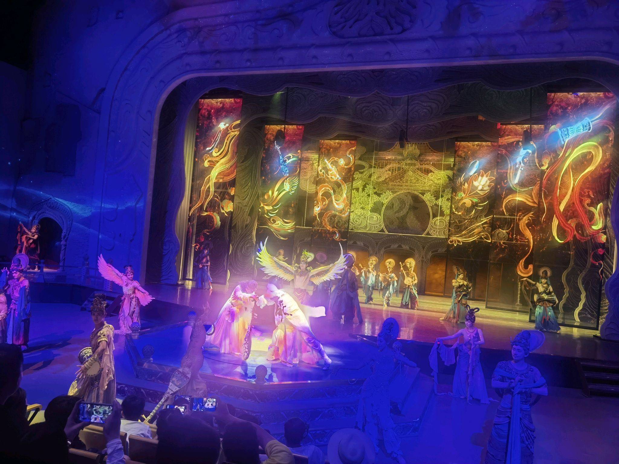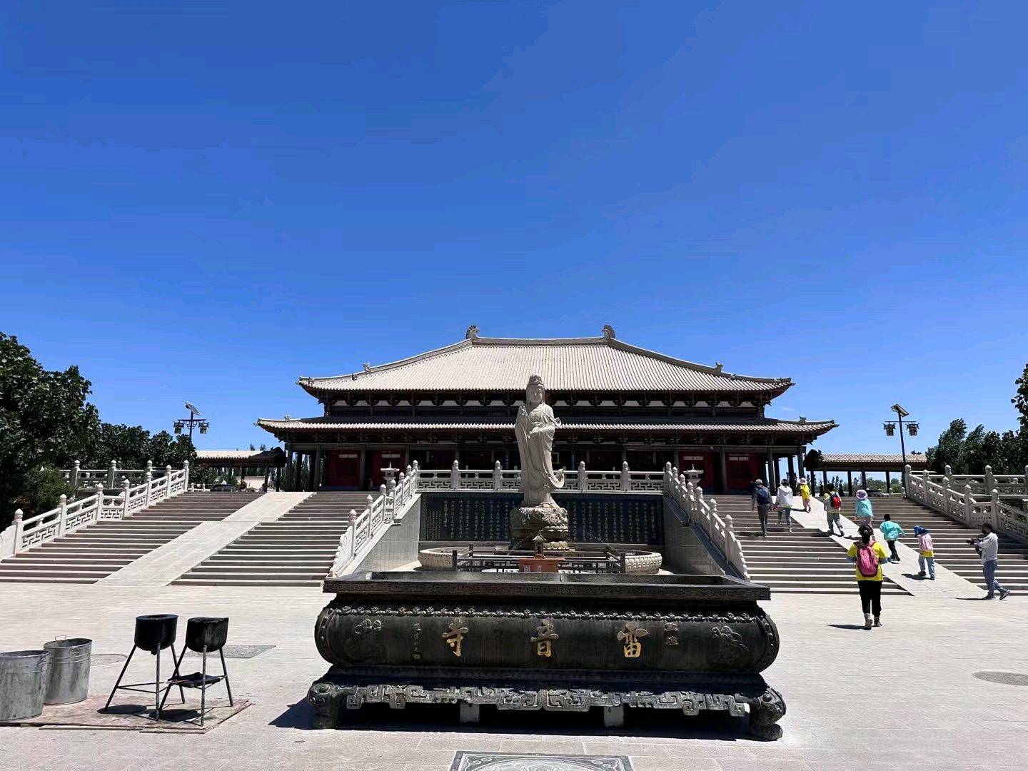 而今的雷音寺已经变成开放式的寺庙,参观不要门票,全部免费,寺庙建筑群非常宏伟,里面有释迦牟尼佛、阿弥陀佛、药师琉璃光如来佛这横世三佛,还有非常多的叫得出名字以及叫不出名字的天王护法、阿修罗等等,这里香火也旺,当地人逢初一十五便会进庙朝拜上香晚上七点我们又去了乐动敦煌参观情景剧演出,据说这是敦煌政府花十个亿打造的演出剧场,里面各种飞天美女,各种佛教圣地故事展现,四面八方的演员陆续出没,恨不得有观音菩萨的千眼一一欣赏到位,一个不落,只怪自己眼睛太少,无法将这立体环绕的舞台表演全部收入眼中