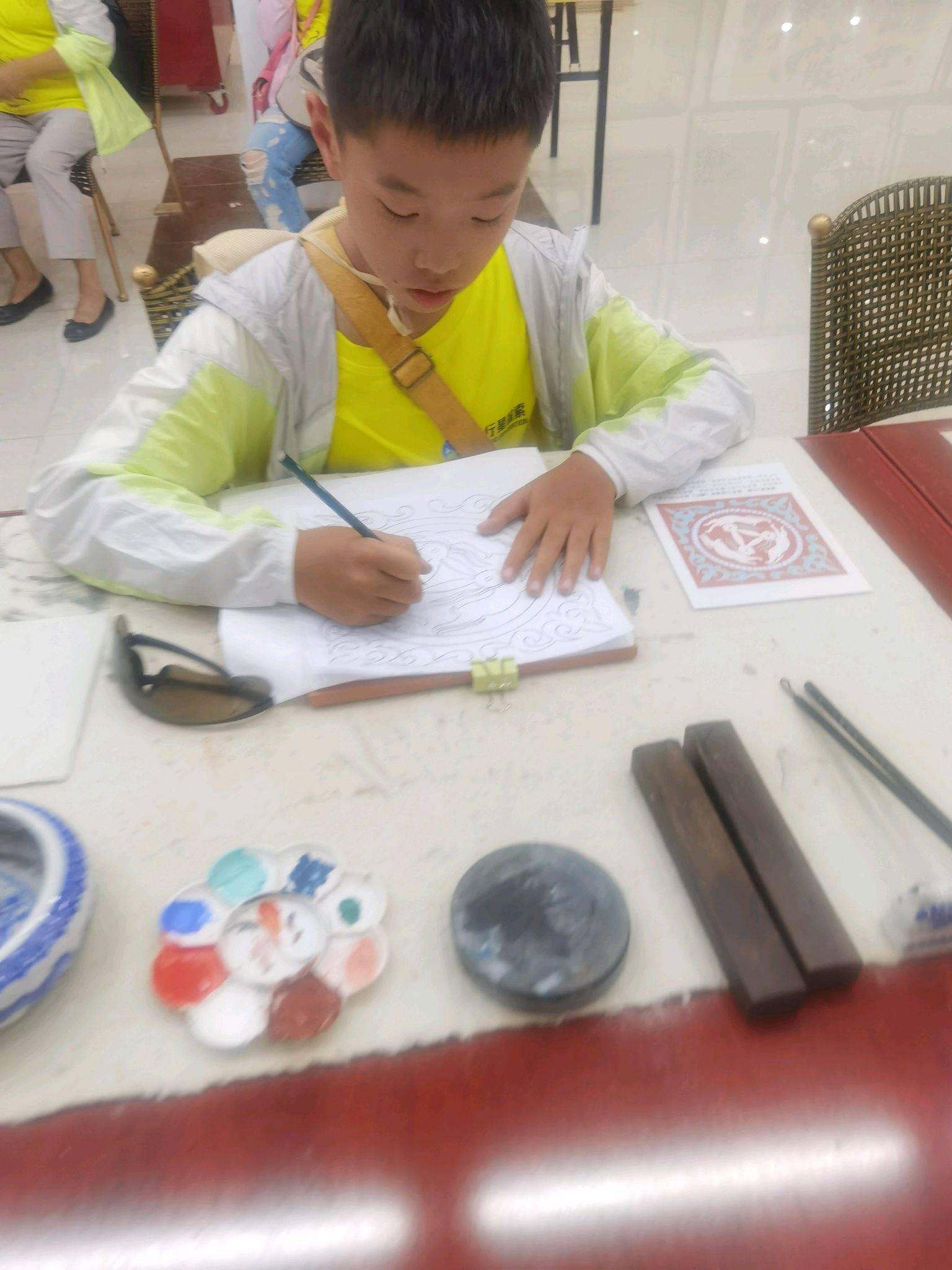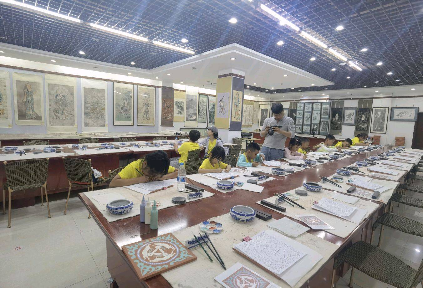 下午到敦煌书画院,进行研学绘画教育,娃娃们临摹并绘制了三兔凿窟图