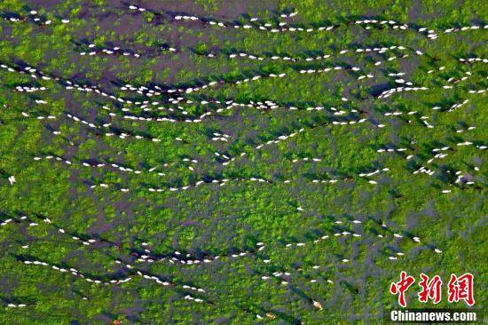 航拍乌兰毛都草原上羊群排队前进。(无人机拍摄)毕力格摄
