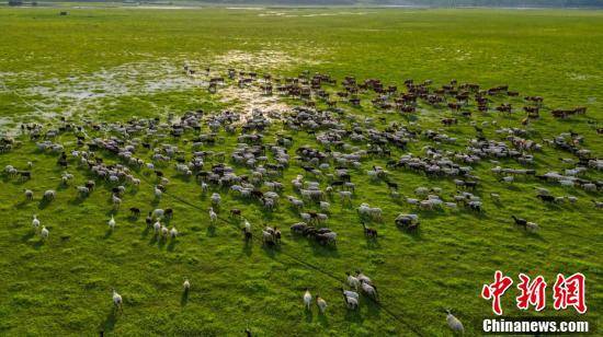 牛羊在草原上悠悠吃草。(无人机拍摄)毕力格摄