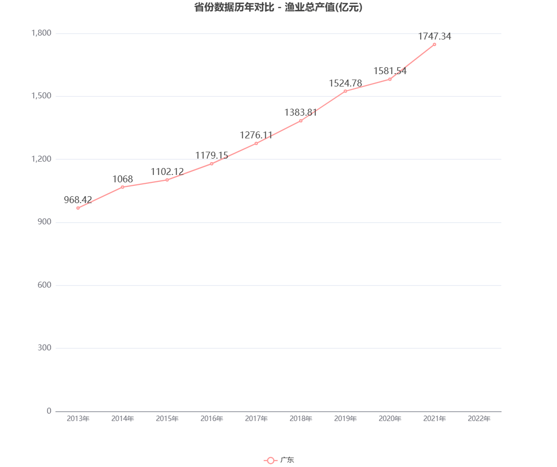 自2013年以来,广东渔业总产值呈现持续增长的趋势。截至2021年,广东渔业总产值已达1747.34亿元,相较于2013年的968.42亿元,增长了近80%。这一数据反映了广东渔业在过去几年取得的巨大成就,同时也显示了广东海洋经济蓬勃发展的生动样本。
