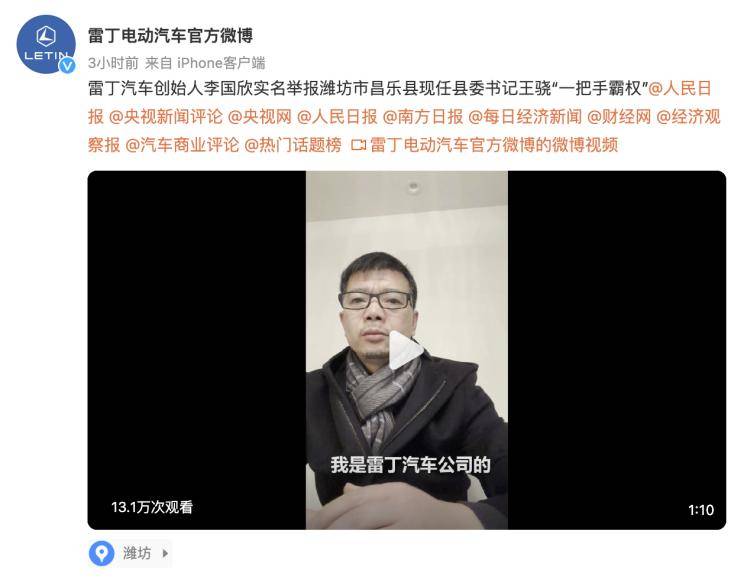 2023年1月,雷丁汽车创始人李国欣在国内社交网络上发布视频,实名举报潍坊市昌乐县现任县委书记王骁。“一把手霸权”,为彰显地方政绩,逼迫企业2022年10个月虚报企业工业产值及销售产值46.83亿元。随后潍坊发布,山东省已成立省市有关部门组成的调查组,进驻昌乐县调查核实有关情况,而此次则是正式结果的公布。而5月,雷丁汽车申请了破产,申请人和被申请人均为雷丁汽车集团有限公司,经办法院为山东省潍坊市昌乐县人民法院。