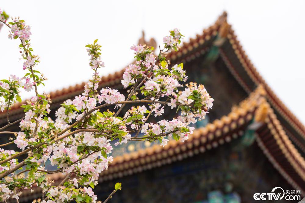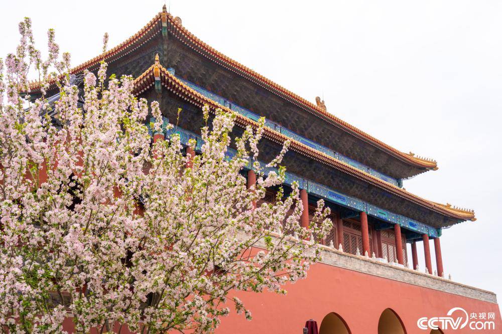 2023年4月5日,北京,故宫神武门城楼前的海棠花盛开。
