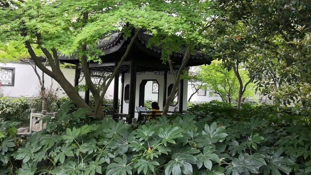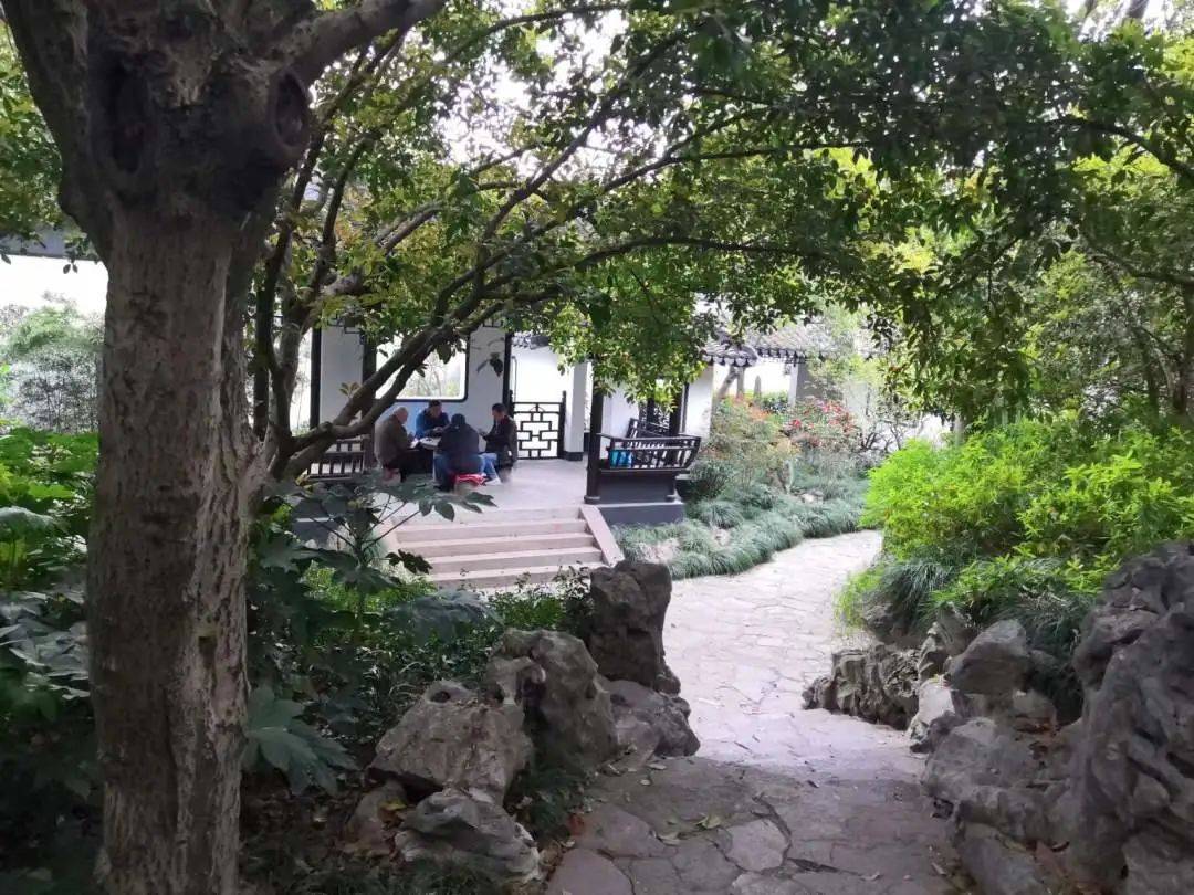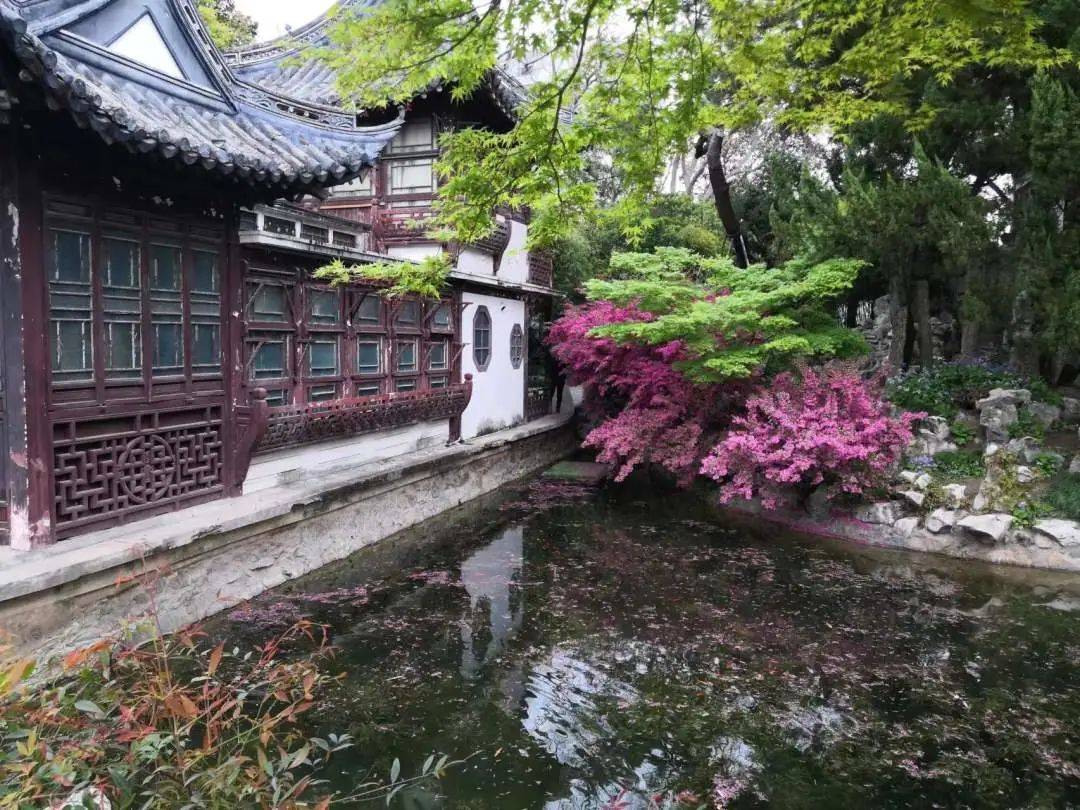 园中古树亭台、奇石花卉,都以一种优美的姿态呈现在游人眼前。灰白色假山石堆砌出低回洞口与台阶高地,在墨绿色湖水中倒映出奇特造型。